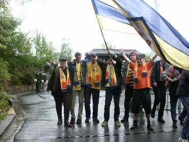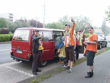 Endlich ! Bei strömenden Regen wurde die rote Wolfsburger Caravelle verlassen und das Stadion alsgeich ausfindig gemacht. Mehrere merkwürdig sprechende Leute wurden dabei überholt und man fragte sich, ob das wohl alles "Kumpel" wären, hier im Erzgebirge. Dann müssten sie, wenn sie denn unsere Kumpel sind, uns wohl auch gewinnen lassen. Hoffentlich denken sie nicht alle wir wären Wolfsburger. Wegen der roten Caravelle. Aber Unglück würde sie wohl kaum noch bringen, war sie doch nicht mit im Stadion. |