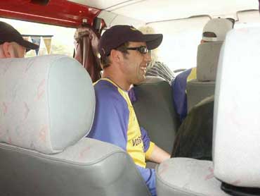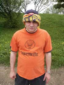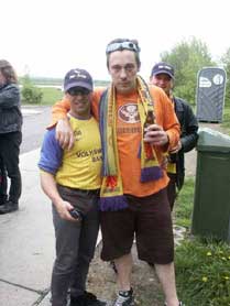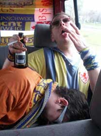 Gesagt - getan. Schön noch mal in die Flossen geault und die vom Vortag quansigen Haare gerichtet und dementsprechend dreingeschaut, sozusagen braunschweigisch-italienisches Styling. Da kann ja nix mehr anbrennen, der Gegner wird bei solch furchteinflössenden Gestalten sicherlich gleich die Hosen voll haben. Verwunderlich wäre jedoch nicht, daß bei diesem Outfit alle denken wir sind wirklich Wolfsburger und sitzen nicht nur in einer, naja, Ihr wißt schon. |