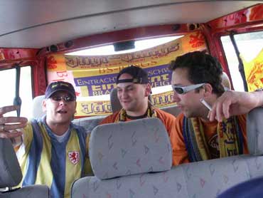 "Scheiße" sprach el presidente, "denkt nicht darüber nach, daß wir in einer roten Wolfsburger Caravelle sitzen, sondern seid froh, daß es kein grünw-weißer Bus, womöglich noch mit Hannoveraner Kennzeichen ist, der statt des "POLIZEI" Schriftzugs ein "VW" Emblem trägt wo drunter steht: "Hier kommt der VfL." "Macht Euch lieber schon mal braunschweigisch zurecht, wir sind gleich da..."