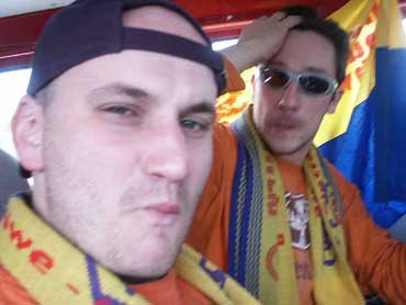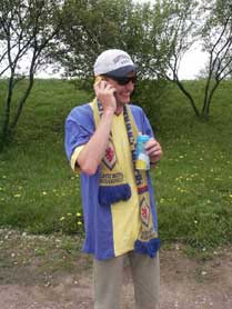 Wie sang schon Purple Schulz einst: "verliebte Jägi-Jungs....". Nicht nur die Heidegeister turteln, auch Eddie geht mal wieder seiner Lieblingsbeschäftigung nach, telefonieren mit der Holden daheim, wenngleich daheim in diesem Falle Hamburg bedeutet. Schön, daß es ein Leben neben dem Fußball gibt. Hätte er allerdings seine Ersatz-Akkus zuhause gelassen, hätten wir bestimmt noch zwei Kisten Bier mehr in die rote Wolfsburger Caravelle gekriegt. Wenn das man kein Unglück bringt.... |