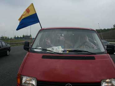 Frohen Mutes und siegessicher ging's dann auf die lange aber kurzweilige Fahrt ins Erzgebirge. Um sämtlichen, an diesem Sonntag reisenden Mitautobahngenossen zu demonstrieren "hier regiert der BTSV", wurde jeder Streckenabschnitt auf dieser Reise, bei dem die Tachonadel unter 45 km/h fiel, dazu genutzt, die kleine Schwester der großen Fahne stolz aus der roten Wolfsburger Caravelle zu halten. Wenn das man kein Unglück bringt.... |
