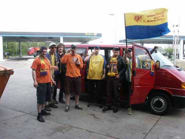 Nachdem mehrere Absprachenversuche zwecks Fahrgemeinschaften gescheitert waren, beschlossen neun Jägi-Jungs in einer mehr oder weniger spontanchaotischen Aktion erstmals in Ihrer Geschichte eine Caravelle anzumieten. Leider stellte sich heraus, daß diese rot war und als wenn das nicht schon genug gewesen wäre, schmückte ein WOB-Kennzeichen sowohl Heck- als auch Frontpartie. Wenn das man kein Unglück bringen sollte... |