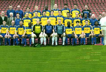 Nach jahrelanger Drittklassigkeit ging man frohen Mutes in die Saison 02/03 und kaufte einen Haufen abgehalfterter Söldner zusammen. Endlich wieder Profifußball. Man siegte im ersten Spiel haushoch, danach gings allerdings nur noch nach unten. Manager und Trainer mussten zeitweise unter Polizeischutz das Stadion verlassen und wurden nach teils erbärmlichen Leistungen der Mannschaft gefeuert. Neu angeheuert wurde das Motivationsmonster Uwe Reinders und endlich eine neuer, erfahrener Manager, Wolfgang Loos. Mit den beiden sollte das Unmögliche möglich gemacht werden und der Klassenerhalt gesichert werden. Bis zum Schluß hatte man gehofft und gekämpft, alles in allem ist es aber der desolaten Hinrunde zu verdanken, dass man knapp aber eben nicht unverdient den bitteren Weg zurück in die Drittklassigkeit antreten musste. Versagt, zum Teil auf der ganzen Linie, hat folgende Mannschaft, die eigentlich nie eine echte war: Oben v.L. Choji, Matros, Küpper, Thomas, Schuchardt, Ridder, Istenic, Niang, Sümnich, Rische, Skolik, mittlere Reihe v.L. Vollmann, Weisheit, Weetendorf, Dziwior, Pientak, Piorunek, Schanda, Thiam, Eigner, Karp, Teixeira, Dr. Stumm, Mehlhorn, Zanter sowie unten v.L. Osthoff, Hörster, Nadj, Kunze, Ogrinc, Spölder, Da Sillva, Fuchs, Mazingu-Dinzey. In der Winterpause kam noch Hutwelker, der ging allerdings dem Gestank des Geldes folgend auch am Ende wieder. |