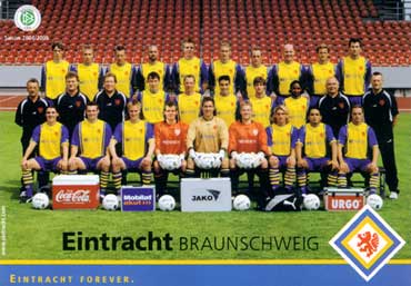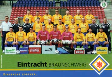 Nach dem Abstieg wurde wieder 2003/2004 überwiegend auf neues Material gesetzt, ein Großteil der alten Truppe wurde zu Recht nicht weiter unter Vertrag genommen. Dazu kam ein beachtlicher Haufen Schulden, zusammengesetzt aus einem viel zu teuren Kader, viel zu hoch dekorierten Verträgen in der Vergangenheit und Missmanagment, welches unter Herrn Loos endlich besser wurde. Man setzte die Hoffnungen weiter auf den Coach Reinders, zufrieden waren damit aber lang nicht alle. Der Start in die Runde war furios, aus den ersten 7 Spielen wurden 19 Punkte geholt und der Eintracht Express rollte in Richtung 2. Liga. Im Pokal wurden der Rote Erzrivale mit 2:0 als Bundesligist besiegt, auch der FC Kaiserslautern wurde mit 4:1 rausgekegelt. Ein unerklärlicher Bruch kam ins Spiel der Mannschaft und man wurde in der Tabelle durchgereicht. Die wohl schlimmsten Erlebnisse waren ein 0:5 gegen Aachen in der 3. Pokalrunde und das erbärmliche Auftreten nach der Winterpause wo man beim abstiegsbedrohten HSV Nachwuchs sang- und klanglos mit 0:1 verlor.Endlich ging der Trainer, verpflichtet wurde Michael Krüger vom Rivalen-Nachwuchs aus Wolfsburg. Mit ihm sollte alles besser werden, wurde es auch, aber auch er konnte nach der verkorksten Serie nicht mehr als einen 6. Platz erreichen. Dabei waren oben v.L. Wegner, Pientak, Jülich, Backer, Zimmermann, Sümnich, Riche, mittlere Reihe Reinders, Skolik, Kranz, Küpper, Thomas, Fuchs, Dimitrijevic, Karp, Dr. Stumm, Hain sowie unten Graf, Jansen, Naja, Stuckmann, Kunze, Spoelder, Adrion, Arnhold und Mazingu-Dinzey. Nicht im Bild die in der Rückrunde verpflichteten Bick und Heimkehrer Rodrigues sowie der nach einigen Spieltagen verpflichtete Lieberknecht. |