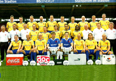 2004/2005: Aus den Fehlern der Vergangenheit anscheinend gelernt hatte man zu Beginn der Saison 2004/05. Ein junges, erfolgshungriges und zugleich schlagkräftiges Team sollte zusammengestellt werden, mit dem Ziel, sich einzuspielen und zu etablieren um in der nächsten Saison den Wiederaufstieg zu realisieren. Ein Trainer, der in der Rückrunde der letzten Saison nach seiner Verpflichtung bewiesen hatte, was er mit jungen Talenten zu leisten vermag durfte Wunschspieler nach Absprache mit Manger Loos kundtun und zu seiner Freude wurden die meisten auch geholt. Gleichzeitig, zur Freude der Fans, wurde erstmals in der Geschichte in von Fans entworfenen Trikots gespielt. Im Laufe des DFB-Pokals wurden die Profis aus Burghausen und Hertha BSC Berlin nach Hause geschickt, man scheiterte erst in der 3. Runde unglücklich beim Nachwuchs des FC Bayern. Was keiner für möglich gehalten hatte, war nach 38 harten Spieltagen die traumhafte Realität: In einem furiosen Saisonfinale erkämpfte eine der beliebtesten Truppen aller Zeiten den sensationellen Titel des RL NORD Meisters und stieg tatswahrhaftig und völlig unerwartet in die 2.Liga auf. Das Unmögliche möglich und sich für alle Zeiten unsterblich machten: oben v.L.: Wegner, Fuchs, Pientak, Jülich, Backer, Patschinsky, Lieberknecht, Sümnich, Rische, Grimm, mittig Krüger, Skolik, Kranz, Küpper, Celikovic, Naja, Bick, Rodrigues, Dr. Stumm, Hain sowie unten Graf, Jansen, Amedick, Kunze, Stuckmann, Spoelder, Tauer, Kuru und Siegert. |