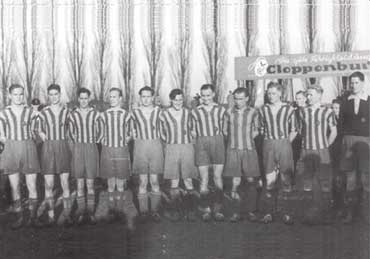 Ebenfalls 1946 zeigt sich hier die Mannschaft auf einer sehr vergilbten Nachkriegspapier-Postkarte. Es gab wieder einen halbwegs geregelten Spielplan und man errang in der Oberliga Niedersachsen Süd den ersten Platz bei 38:4 Punkten und 84:21 Toren. Damit Qualifizierte man sich für die neue Oberliga Norddeutschland, die ab der Spielzeit 1947/1948 startete. Das dies gelang ist folgenden Herren gutzuschreiben v.L. : Schemel, Liese, Hagenacker, Mende, Rohrberg, Fricke, Müller, Broschat, Ender, Naab und Keil. |