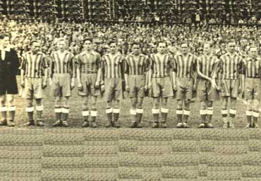 Dieses Bild zeigt die Stammelf der Saison 1947/48. Nach den Kriegswirren gab es endlich wieder ein norddeutsche Spielklasse, die Oberliga Nord. 12 Mannschaften kämpften um Punkte. Die Eintracht war ein Zuschauermagnet und erreichte einen Schnitt von über 13.000 Zuschauern, alleine die Spiele gegen St. Pauli und den HSV besuchten 25.000 bzw. 30.000 Zuschauer im heimischen Oval. Die Rothemden Fraktion aus einer kleinen Stadt in der Nähe von Braunschweig hingegen wollten nur 6.000 sehen, wen interessieren die auch schon. Interessant allerdings, dass sich diese sang und klanglos nach einem Jahr wieder aus der Liga verabschiedeten währen die Eintracht hinter den beiden Hamburger Clubs auf Rang landete. Auf diesem Bild warten auf den Anpfiff: |