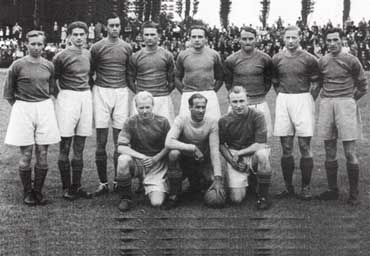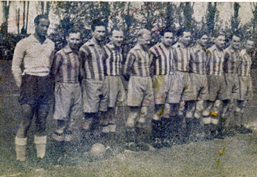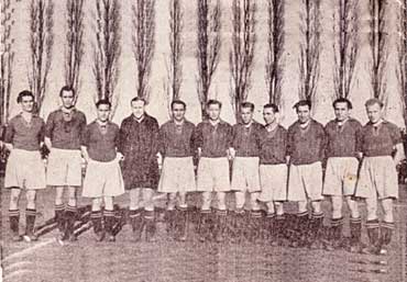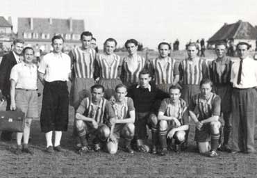 In den Kriegsjahren 1942/43 wurde kurioser Weise auch Fußball gespielt. Galt es doch, das Volk bei Laune zu halten, schließlich stand zu dieser Zeit auch noch Stein auf Stein in der Heimatstadt und keiner ahnte, was im Herbst 44 passieren sollte. Die Liga trug einen so lächerlichen Namen wie „Gauliga“, das störte die Jungs aber nicht und man beendete die Gauliga Südhannover/Braunschweig mit der Ausbeute von 35:1 Punkten und 146:20 Toren als Spitzenreiter. Dabei gelang mit einem 21:0 gegen Göttingen 05 der bis heute höchste Pflichtspiel-Sieg der Vereinsgeschichte. Dafür verantwortlich zeichneten sich v.L. : Helmut Fricke, Schemel, ein Unbekannter, Stark, Naab, Ender, Hogenkamp, Matschinski, Willi Fricke, Keil und Ehlers. |